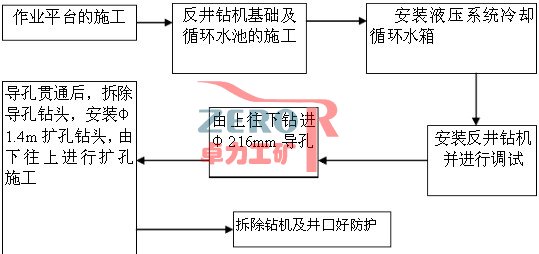作業(yè)平臺的施工 反井鉆機基礎及循環(huán)水池的施工 安裝液壓系統(tǒng)冷卻循環(huán)水箱 安裝反井鉆機并進行調試 由上往下鉆進Φ216mm導孔 導孔貫通后,拆除導孔鉆頭,安裝Φ1.4m擴孔鉆頭,由下往上進行擴孔施工 拆除鉆機及井口好防護