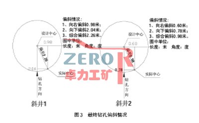 在完成的兩條斜井中,第一條最終實際透孔位置較設計透孔中心向下偏斜2.O4m,向右偏斜0.98m,綜合偏斜2.26m,鉆孔長度212.62m,綜合偏斜率1.06%;第二條最終實際透孔位置較設計透孔透孔中心向下偏斜O.78m,向右偏斜O.6Om,綜合偏斜0.98m,鉆孔長度212.76m,綜合偏斜率0.46%.兩條斜并在鉆孔較深、巖層較硬的條件下,偏斜度的控制均取得了良好的效果。透孔具體情況見圖3。